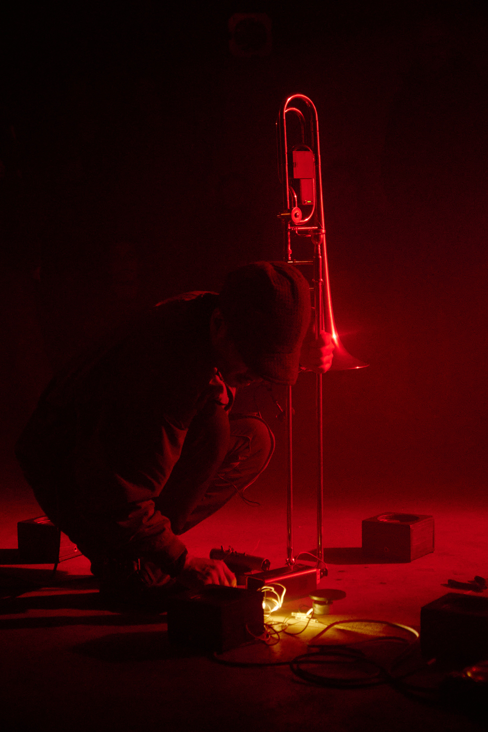 Tadashi Yonago (JP) plays trumpet and self-built sonic generators. When he is not operating in groups with obscure names such as SjQ and SjQ++ he gives workshops, runs the DIY Space PORT (in Osaka) and installs self-made vending machines in urban space.